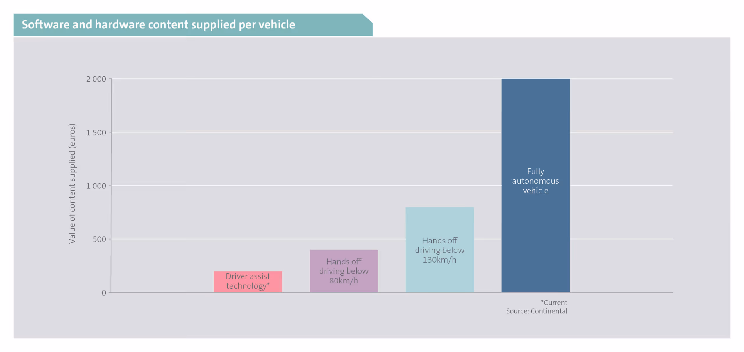 Continental’s automotive division has invested extensively in software development and is looking to increase its share of the vehicle software market. Coupled with the development of a software subscription revenue base, this should significantly add to the profitability of the business. Continental’s competitive advantage is its ability to integrate software and hardware, given that it produces both. As shown below, this would result in increasing the value of its content supplied to auto manufacturers, in turn significantly boosting profitability.