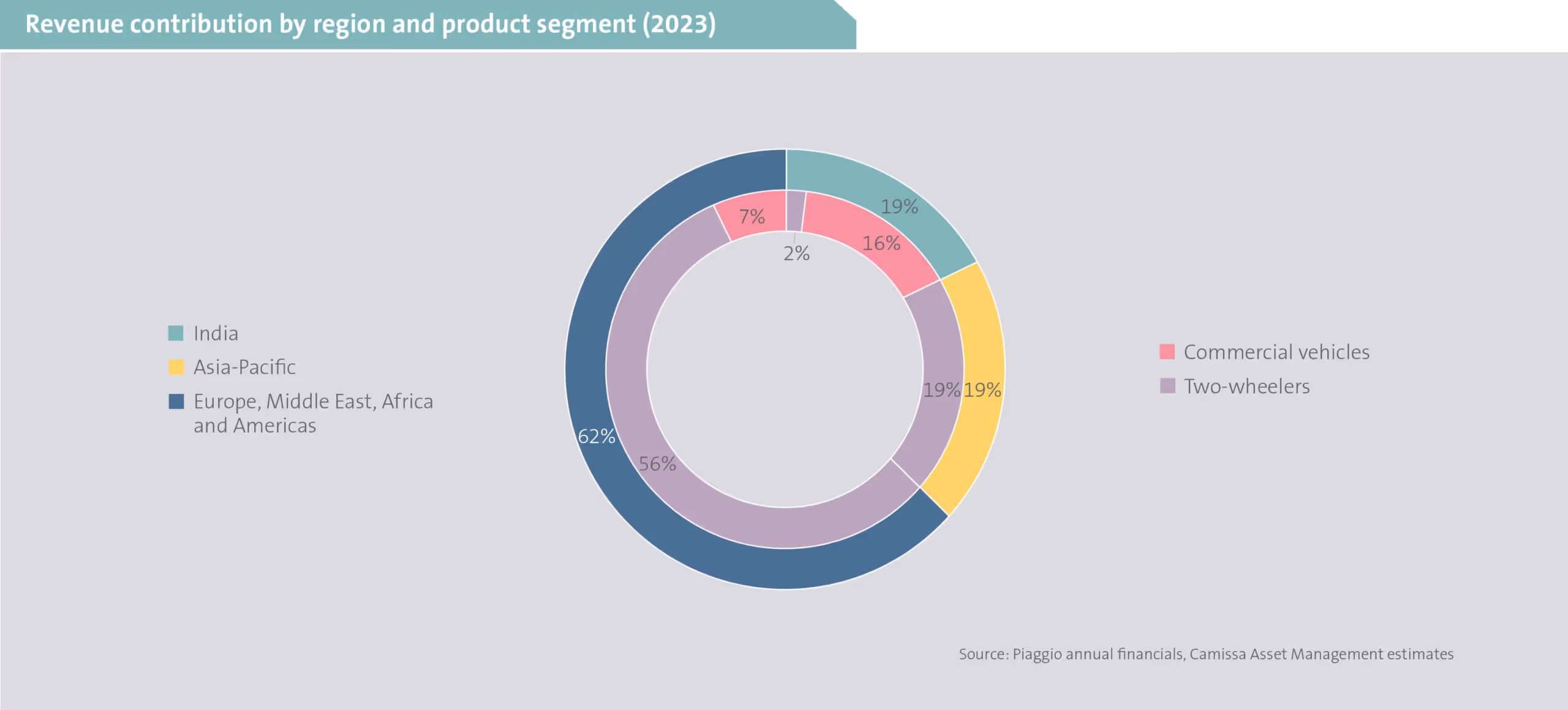 India is the world’s largest two-wheeler market, with just over 17 million sold in 2023. Approximately two-thirds of two-wheeler volumes sold in India in 2023 were motorbikes, a product segment in which Piaggio is substantially under-indexed. Piaggio sold 41 000 two-wheelers in India in 2023, indicating its small presence yet large potential for market share growth.