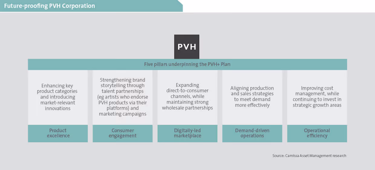 Recognising the need to evolve in a fast-changing industry, PVH launched the PVH+ Plan in 2022 – a roadmap designed to strengthen its core brands and encourage sustainable, long-term growth. As illustrated below, the plan is built around five strategic pillars designed to build resilience and ensure competitiveness in a market increasingly shaped by digital innovation and growing sustainability demands.