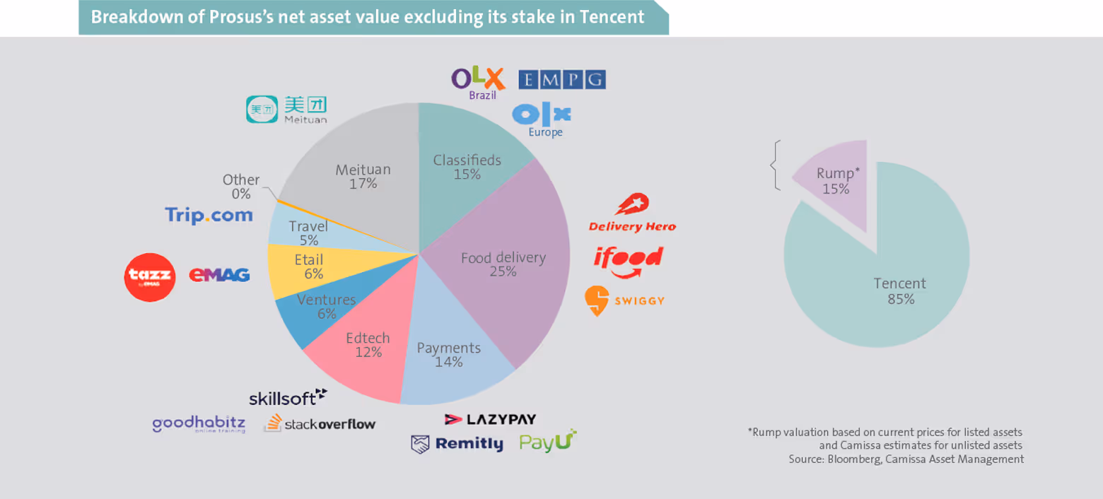 Prosus’s net asset value (NAV) is predominantly composed of Tencent, which accounts for roughly 85% of the group’s NAV. The remaining portion, the rump, encompasses a diversified array of online enterprises, as illustrated below.