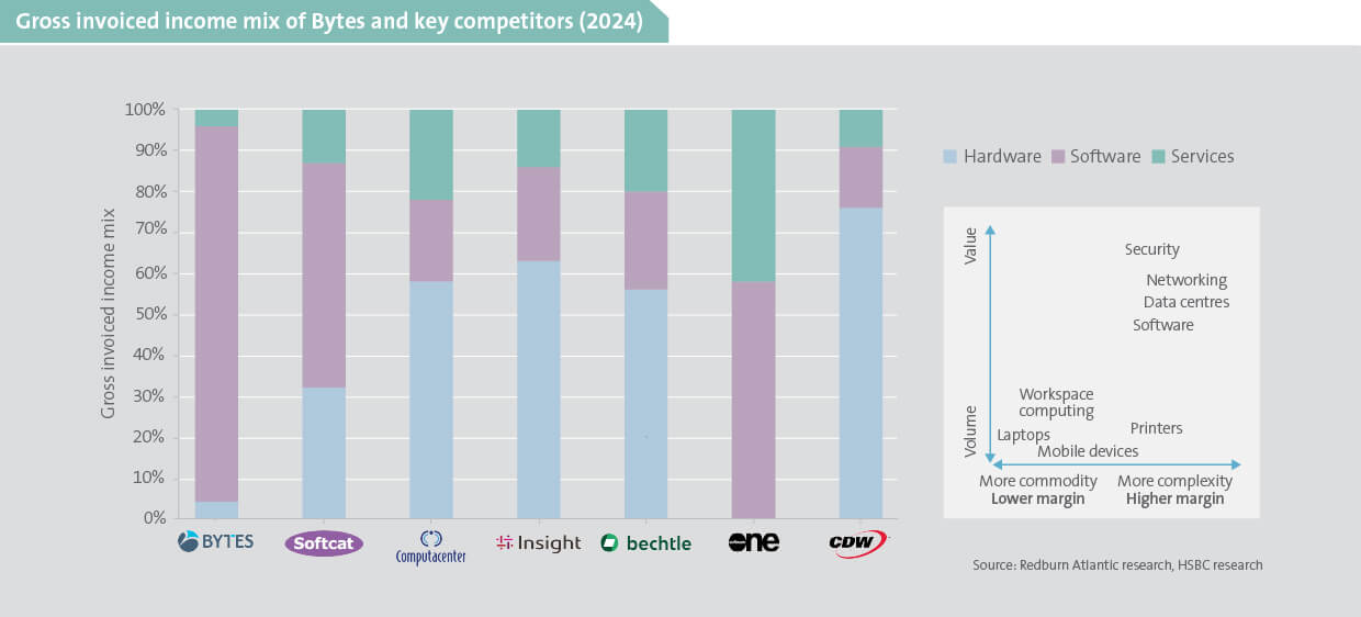 Bytes distinguishes itself primarily as a software reseller. As illustrated below, 90% of its sales are software related, which has been the fastest growing area of IT spend globally. Importantly, the value increases with complexity. Routine hardware procurement is reasonably commoditised, while software, security and cloud services are more specialised, therefore generating higher margins and profit per sale.