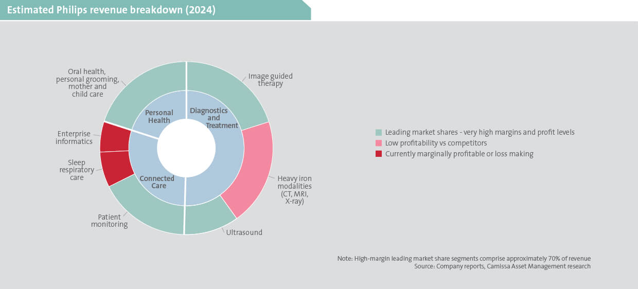 By disaggregating Philips’ three core businesses into their underlying components, we conclude that currently just under 70% of group revenue is generated by businesses with strong profitability and competitive advantages, such as Cardio Ultrasound, Patient Monitoring and Personal Care. These units hold dominant market positions and benefit from strong after-sales and recurring revenue streams. A further 15-20% of the portfolio, comprising Sleep Care and Enterprise Informatics, is temporarily underperforming but set to normalise to far higher profitability in the near term. While the remaining businesses, made up of lower margin imaging modalities, continue to lag competitors, management’s ongoing streamlining efforts offer positive optionality to the broader investment case.