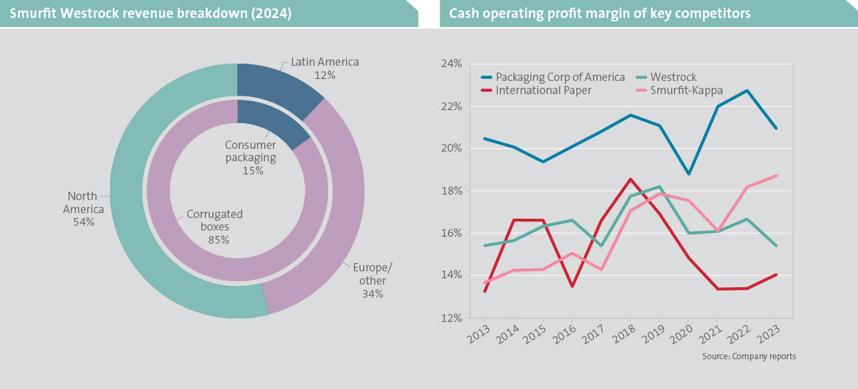 Smurfit Westrock started out as a small box-making business in Dublin in 1934, founded by John Jefferson Smurfit. Through several mergers – notably with Stone Container Corporation in 1998 (USA) and Kappa in 2005 (Europe) – the business morphed into a large, predominantly European-focused packaging leader called Smurfit-Kappa. The most recent merger with US-based Westrock in 2024 has made Smurfit Westrock one of the largest global packaging companies, now generating 54% of revenues from North America, 34% from Europe and 12% from Latin America (charted below left). The majority of revenue (85%) is derived from the sale of corrugated box solutions, with the remaining 15% generated from selling other forms of consumer packaging products. The Smurfit family remains actively involved, with CEO Tony Smurfit leading the business that was founded by his grandfather.